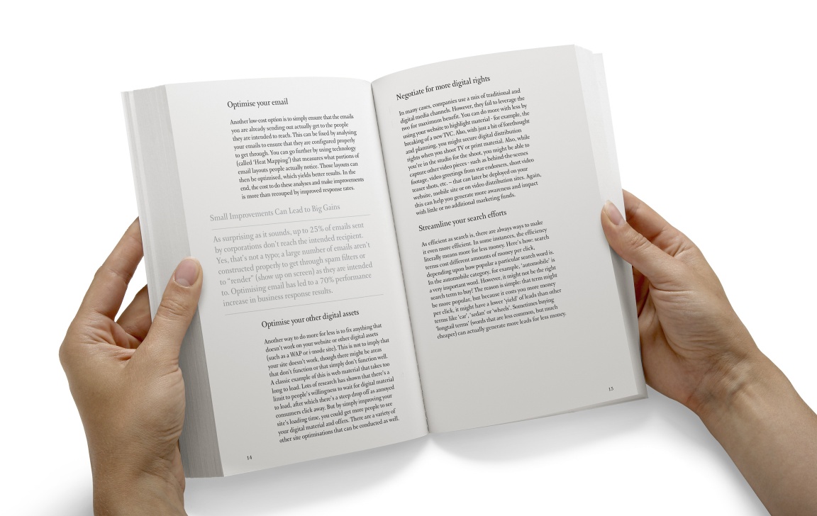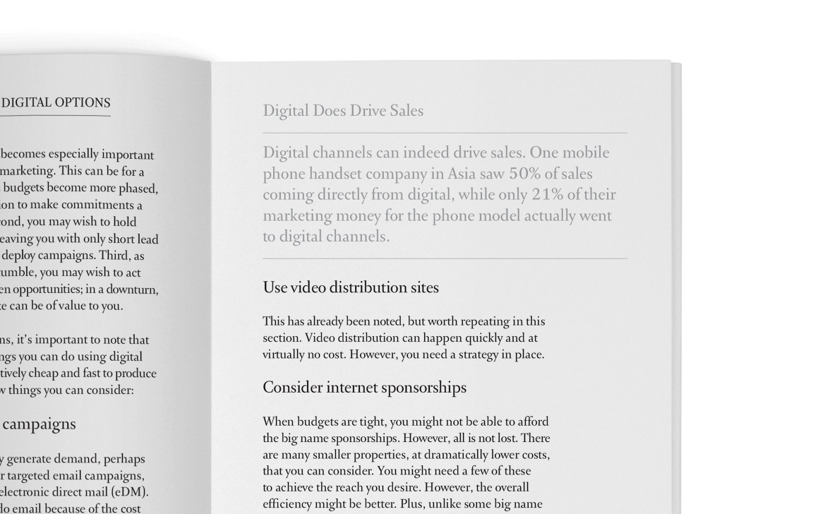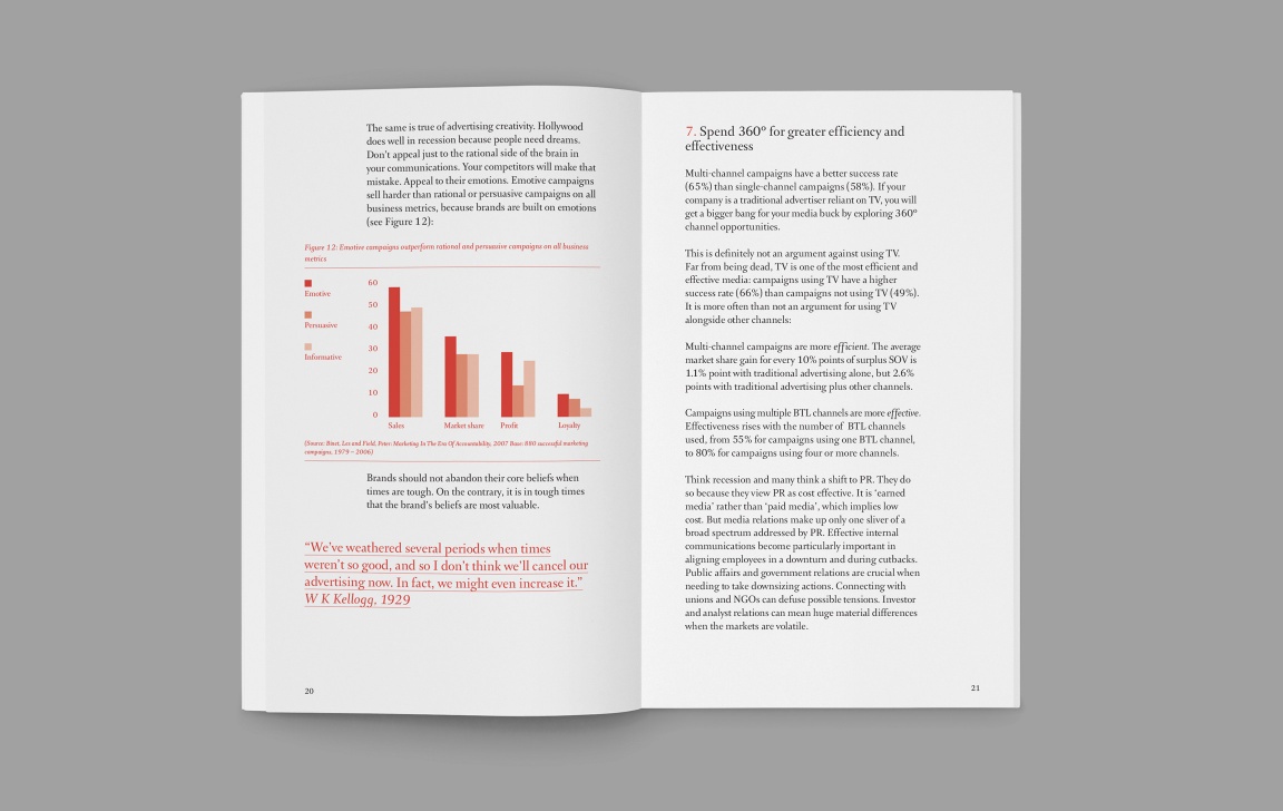 Zebra designed a set of six books that drew on Ogilvy’s experience in helping their clients during a recession. The demand for the books surfaced when Ogilvy’s clients started to anxiously seek out more cost effective solutions to help support their businesses during a difficult economy.