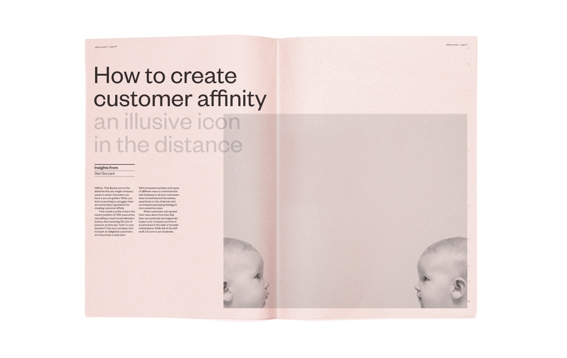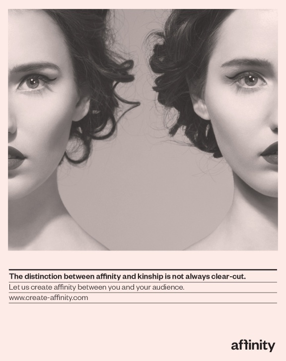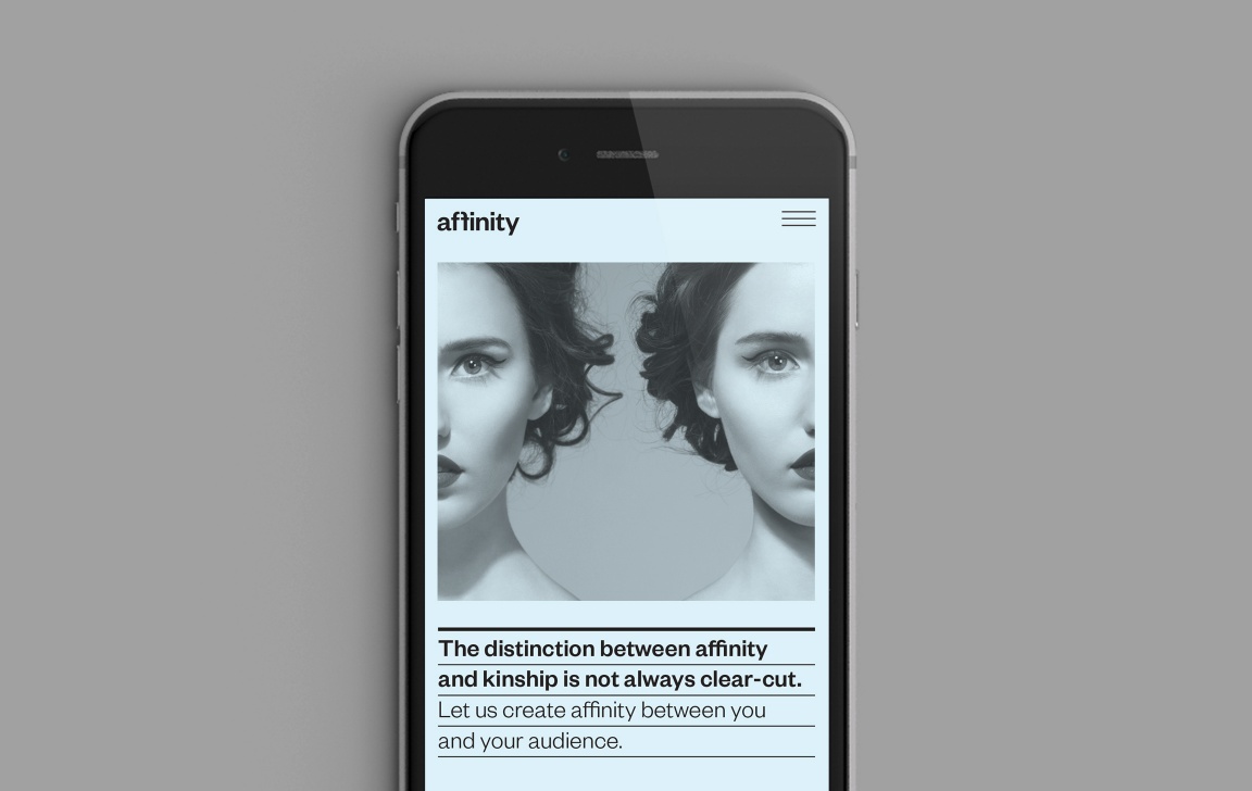 The two letter f’s within the logotype face each other to visually represent the affinity between two separate partners, coming together to achieve a greater good collaboratively. Imagery of twins helps further represent the idea of a close affinity between two parties. One twin represents Affinity’s client and the other represents the client’s target audience.