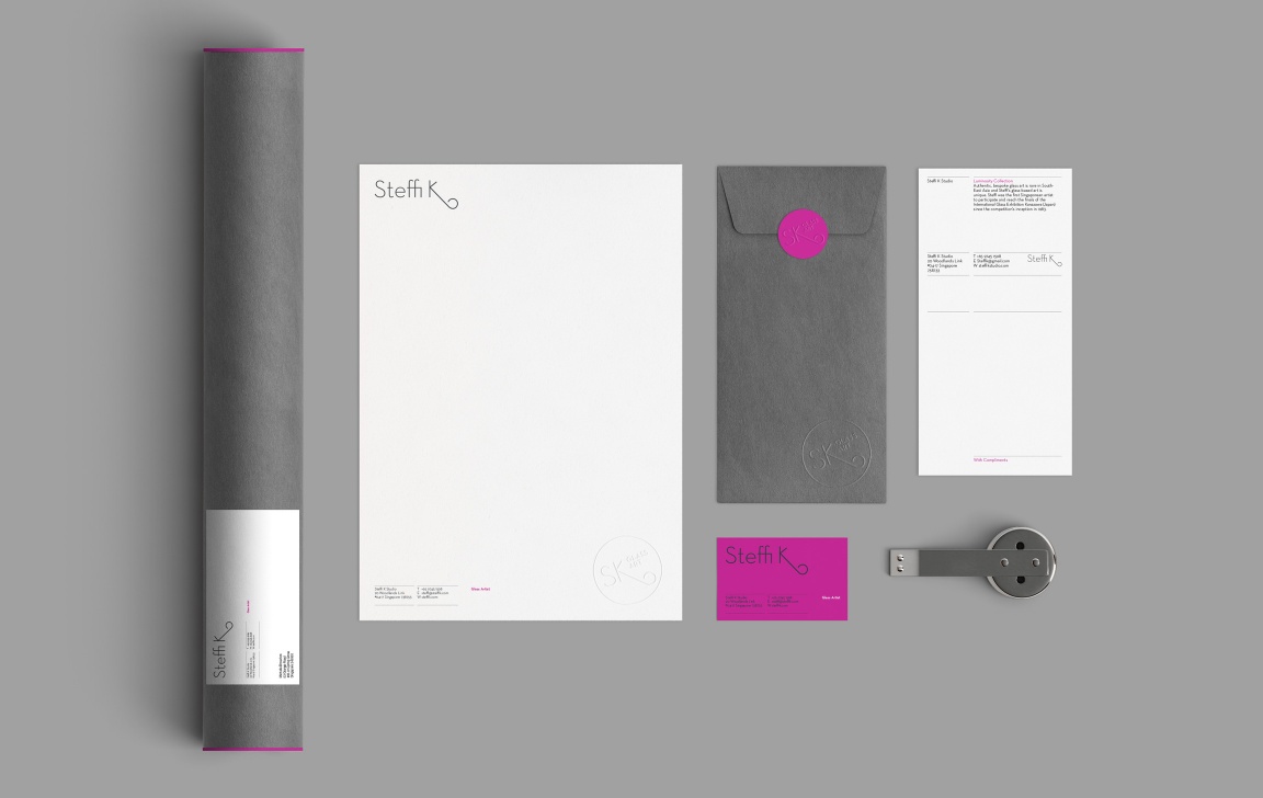 The curl within the letter K is a nod to glass blowing techniques as well as being representative of Steffi’s fluid working style. The design was applied across multiple communications that included stationery, price tags, gift bags and portfolio folders.