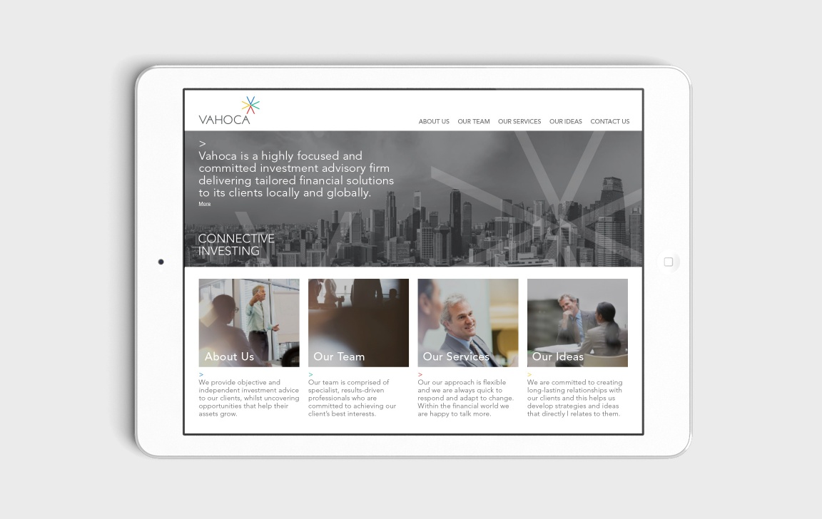 Zebra were engaged by LynxEye brand consultants to develop a visual identity based on the brand strategy they had developed. The brand promise of ‘connective investing’ was our starting point along with the brand values of convinced, committed, candid and curious. We started by developing a new symbol, an asterisk representing connectivity and made up of interconnecting letter V’s taken from the V of the Vahoca wordmark.
